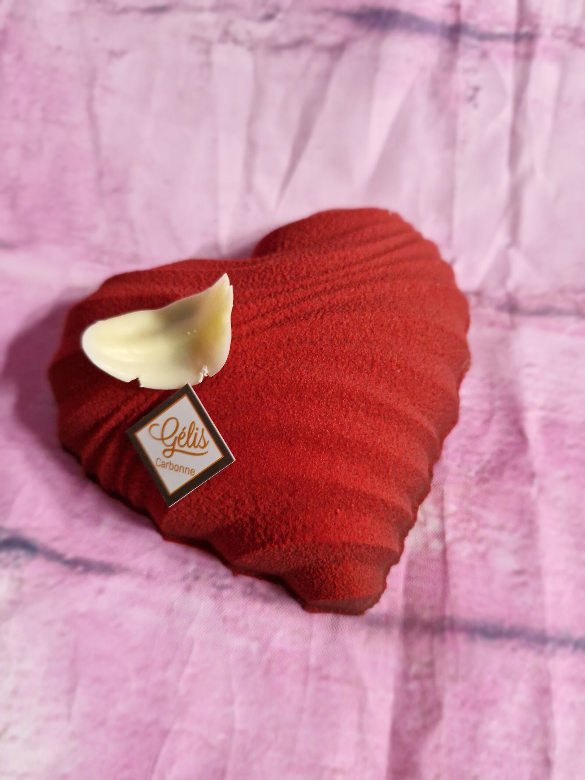Cœur en chocolat noir garni de guimauve vanille, décor velours rouge, spécial Saint-Valentin, fabrication artisanale Maison Gélis